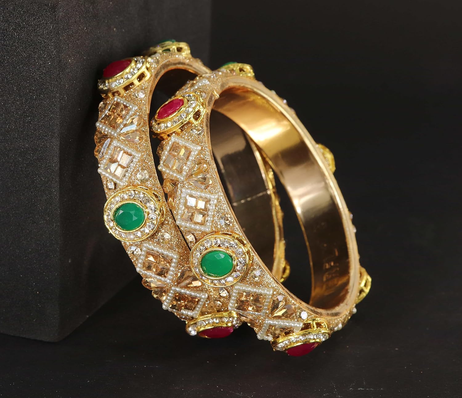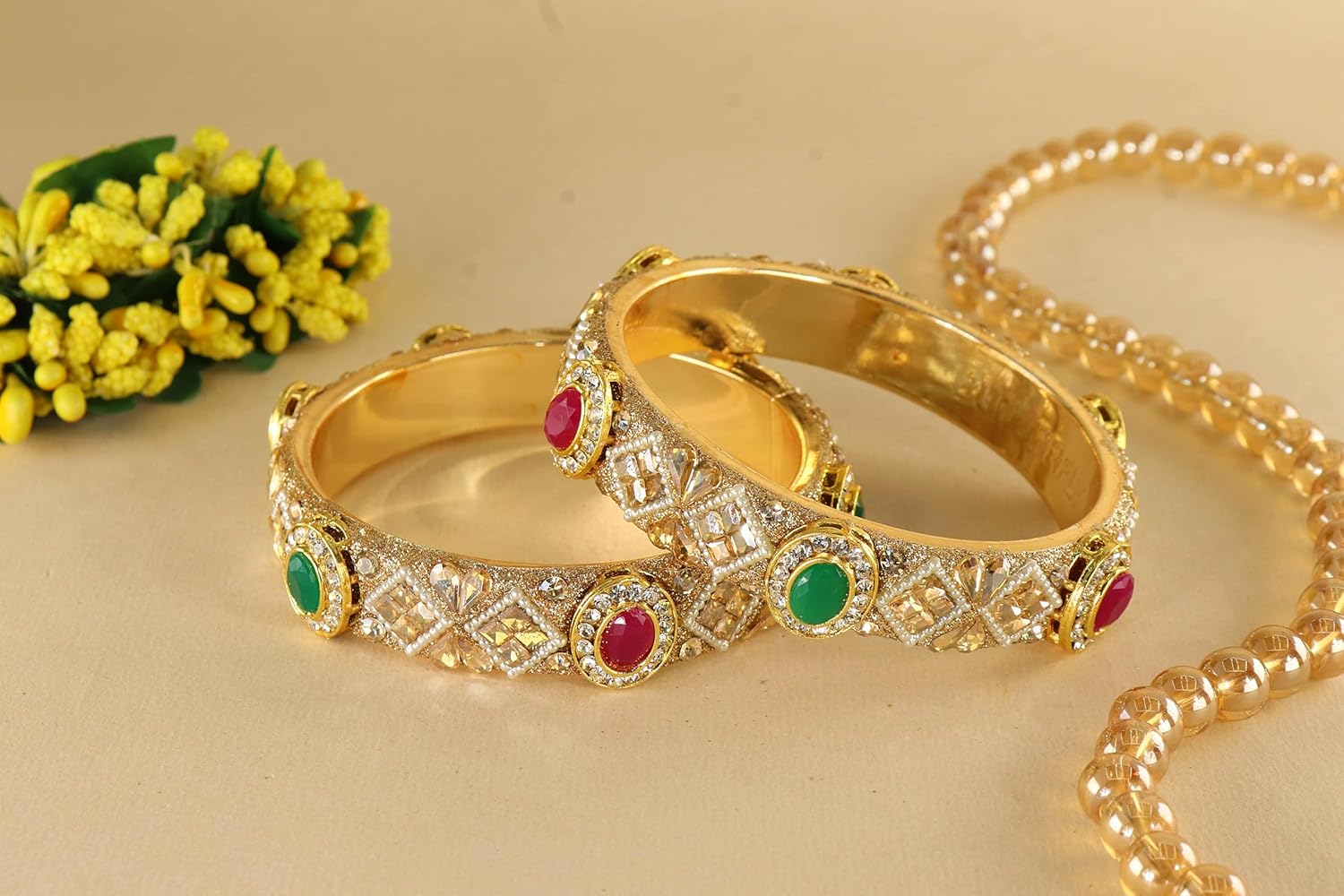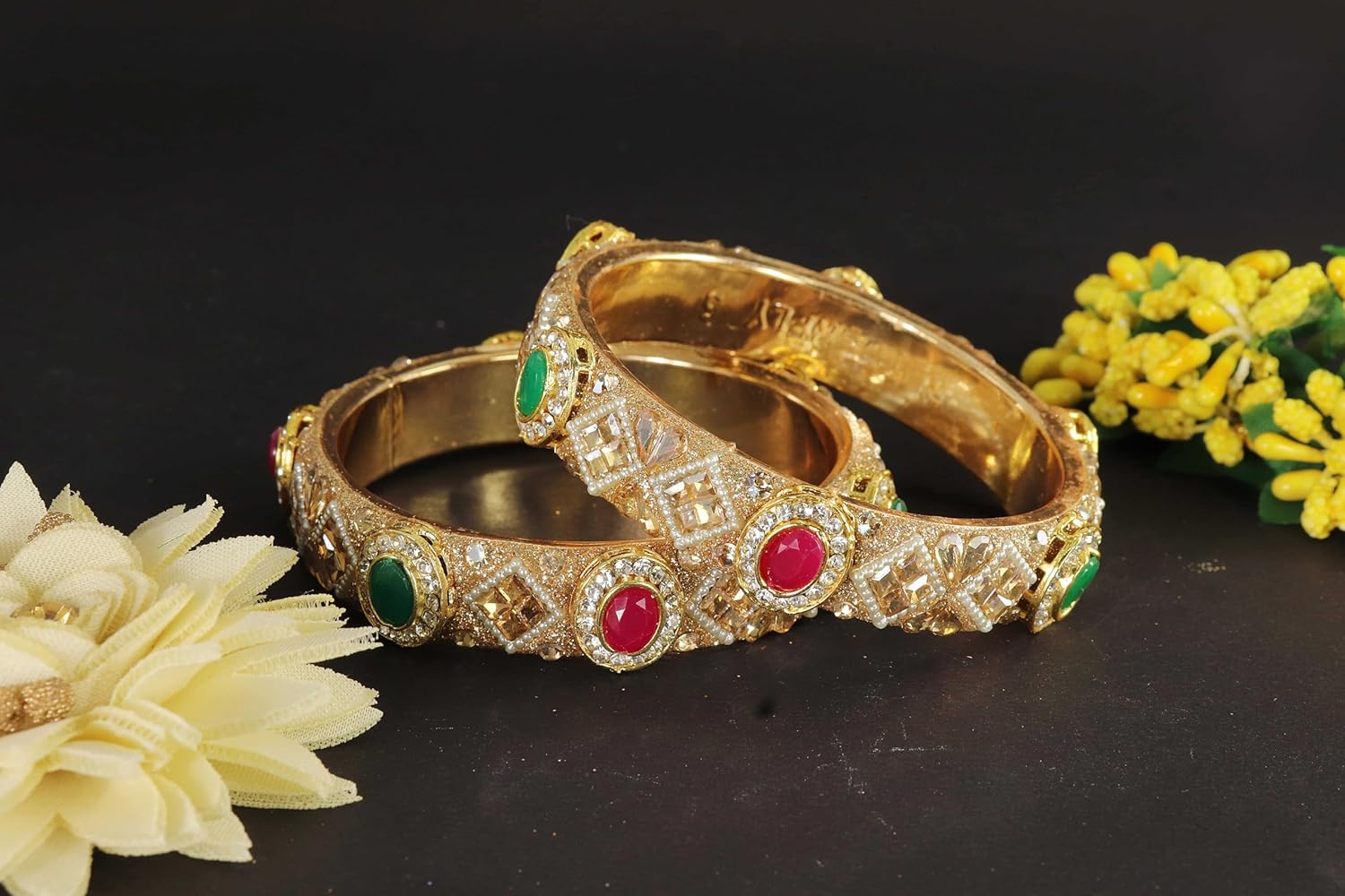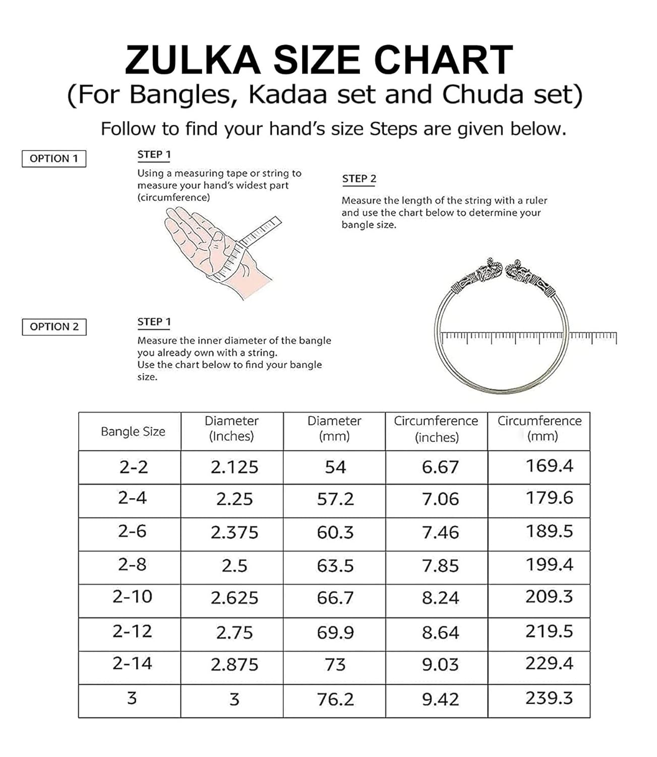 ZULKA Presents Traditional Gold Plated Brass Metal Bangles Set For Women & Girls with Golden Zircon Diamonds, Kundan Stones & Beads Work. These Designer Women Bangles Set is a Beautiful piece of Hand Jewellery that combines New Style with Modern Beauty, capture the essence of a Wedding, Party, Anniversary, Function, Festival, Daily Wear & Special Occasion. These Bangles are made from High-Quality Golden Brass Metal, Zircon Diamond, Kundan Stones & Beads. Those Bangles are durable and of vibrant colours symbolizes love, passion, and new beginnings. The intricate design showcases ZULKA’s skillful craftsmanship, ensuring you shine on your special day. The set also doubles as a versatile piece of bridal jewelry, complementing a wide range of outfits, including classic red sarees and modern lehengas. ZULKA prides itself on offering the finest quality, timeless style, and unwavering commitment to tradition. The set is designed to make your Special day extra special, ensuring you look and feel your best. Elevate your bridal ensemble with ZULKA’s Bangles Set and make memories that will last a lifetime. These ZULKA’s Designer Bangles Set Have a Premium Finish and are Perfect for Weddings, Engagements, Functions, Festival, Rituals, and Events. The Brand ZULKA sells all types of Glass Bangles, Metal Bangles, Acrylic Bangles, Chuda Sets, Kaleera Latkan Sets, Kadas, Bracelets, Women’s and Girls Traditional to Modern Jewellery, and many More. And Please Refer to our Size Chart to Know your Hand Size Precisely. Clean bangles with a smooth cotton cloth, avoid direct water, perfume, deodorant, sunlight, and chemicals, and store in an airtight zip-lock pouch to maintain longevity. Thank You For Choosing ZULKA’s Traditional Women’s Bangles Collection on Amazon.